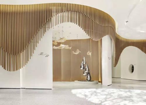 广东德宝龙建材有限公司主营:铝单板、铝方通、弧形方通、铝花格、铝格栅、铝蜂窝板、铝幕墙、覆合实木皮铝单板、PVC进口膜等等...现在越来越多装饰用铝方通的产品做吊顶和幕墙,无论是家庭吊顶装饰还是各种大型场所都已经成为大家首选的装饰材料了,铝方通的优点和可再回收让越多人选择它,因为铝方通它开放的视野、通透、透气、线条明快整齐、造型多变、层次分明,既可以体现现代风格,也可以有古典韵味,还有安装和拆卸都简单方便。用于人流多密集的地方会便于空气的流畅、排气、散热、所以就成为近些年的主要材料。恒特建材的方通造型多变,颜色也是根据客户需求定制,铝方通的表面处理也是有讲究,如果是用在室外,我们会建议选择氟碳喷涂来处理,因为氟碳喷涂在室外风吹雨淋20-50年可以不变色,而室内就会选粉末喷涂、木纹转印或我司特有的PVC进口膜,如果想要有立体感和木饰面的效果就建议用PVC覆膜。而以上都是用方通来做的造型装饰,给视觉和质感都是一种美。